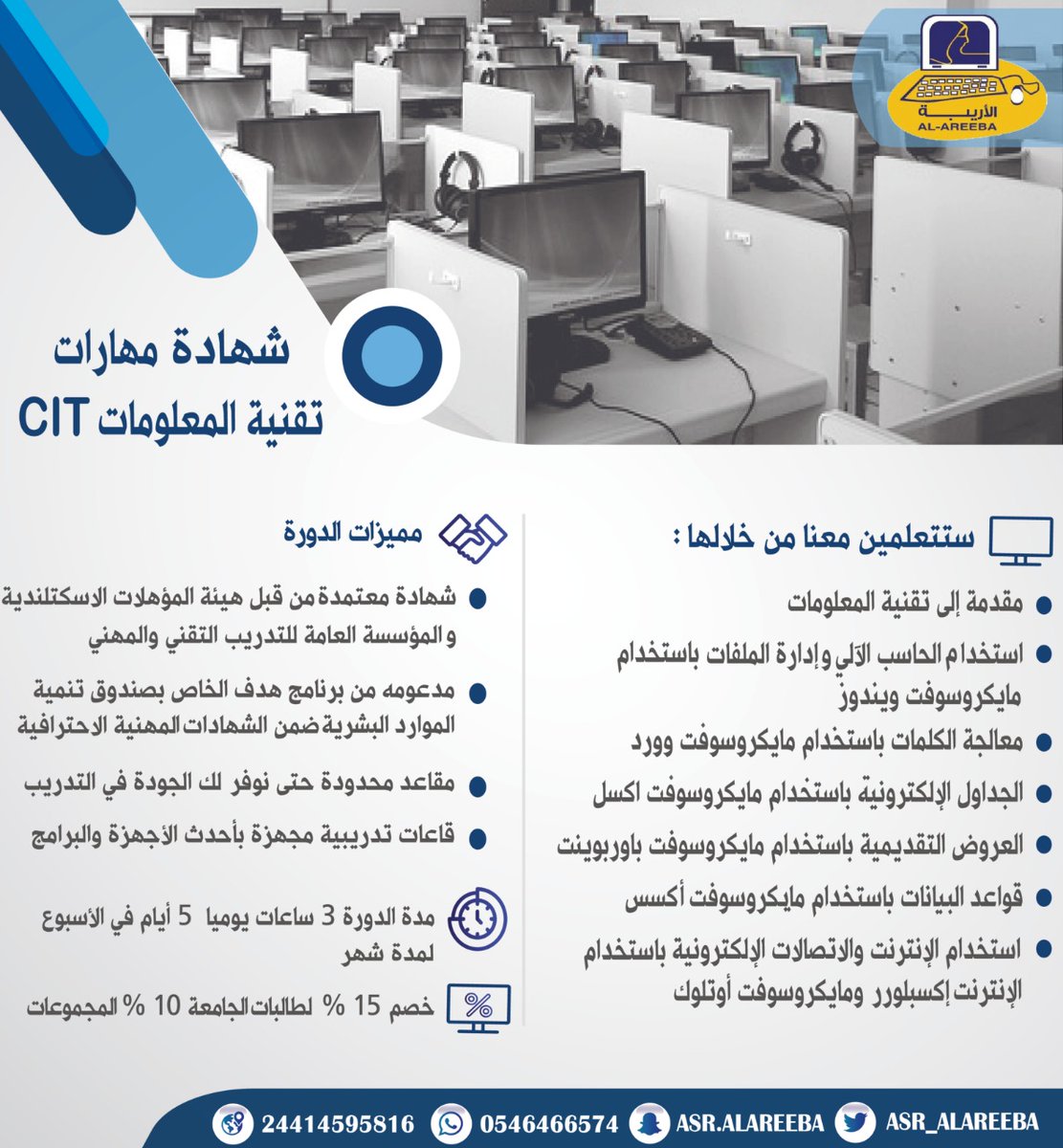 معهد عصر الأريبة النسائي للتدريب Twitterren أضيفي شهادة مهارات تقنية المعلومات Cit لـ سيرتك الذاتية وأحصلي على تعويض مالي من صندوق تنمية الموارد البشرية بعد حصولك عليها سجلي الان للانضمام معنا
